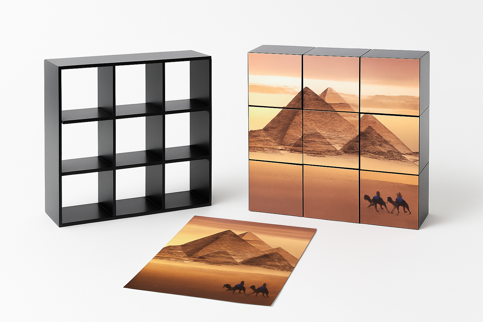 Start your performance by showing 9 photos printed cubes nd 6 pictures and an empty frame ; a random audience chooses an image ; you order the cubes into the frame according to the chosen image and then show the chosen card to everybody then turn the frame around …